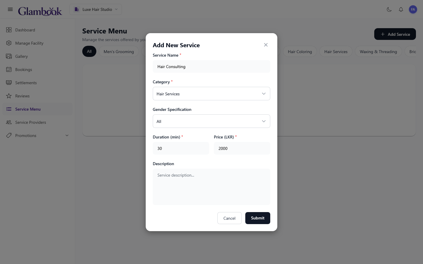 - Enter the service name, select a category, set the duration (in minutes), and set the price