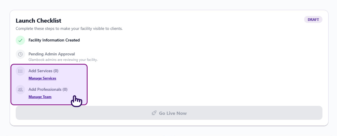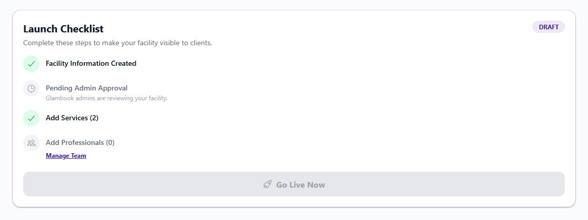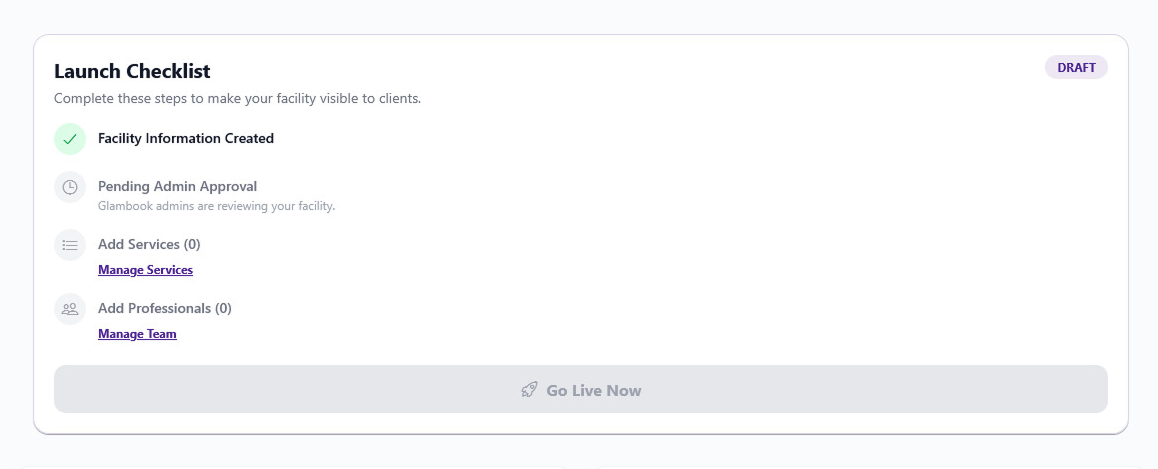 - Your checklist will show "Pending Admin Approval" with the message "Glambook admins are reviewing your facility"