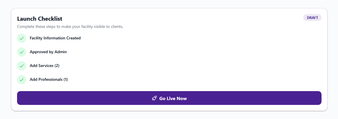 Once all checklist items are complete — your salon is approved, you've added at least 1 service and 1 professional — the Go Live Now button becomes active.