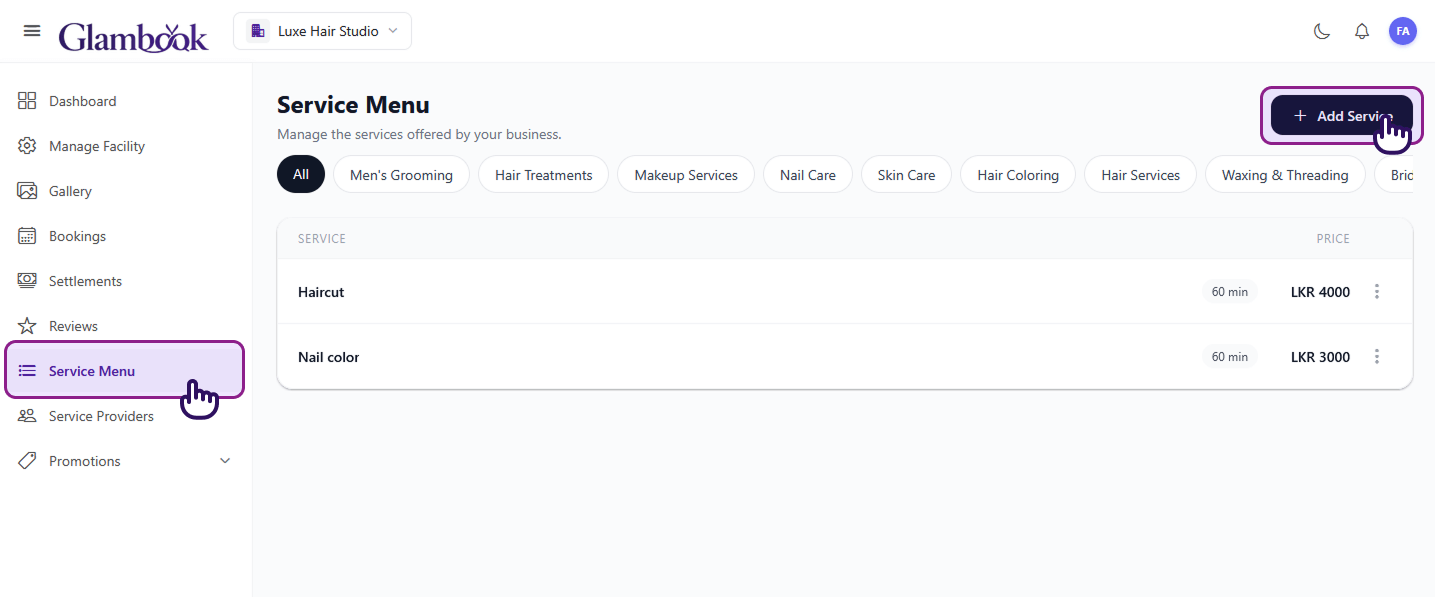 - Category — select from the dropdown (e.g., Hair Services, Men's Grooming)