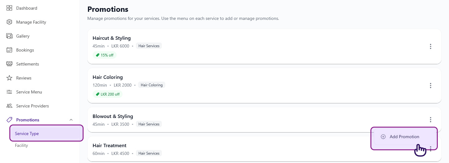 Create discounts to attract more clients and boost bookings. Glambook supports two types of promotions: Service Promotions and Facility Promotions.