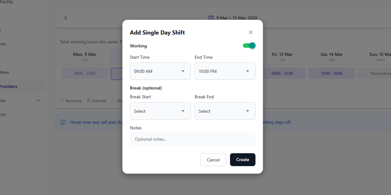 - Multiple providers can have different shifts — each provider has their own schedule