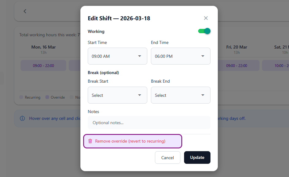 - Single-day overrides — one-time changes for a specific date (different hours or a day off)
