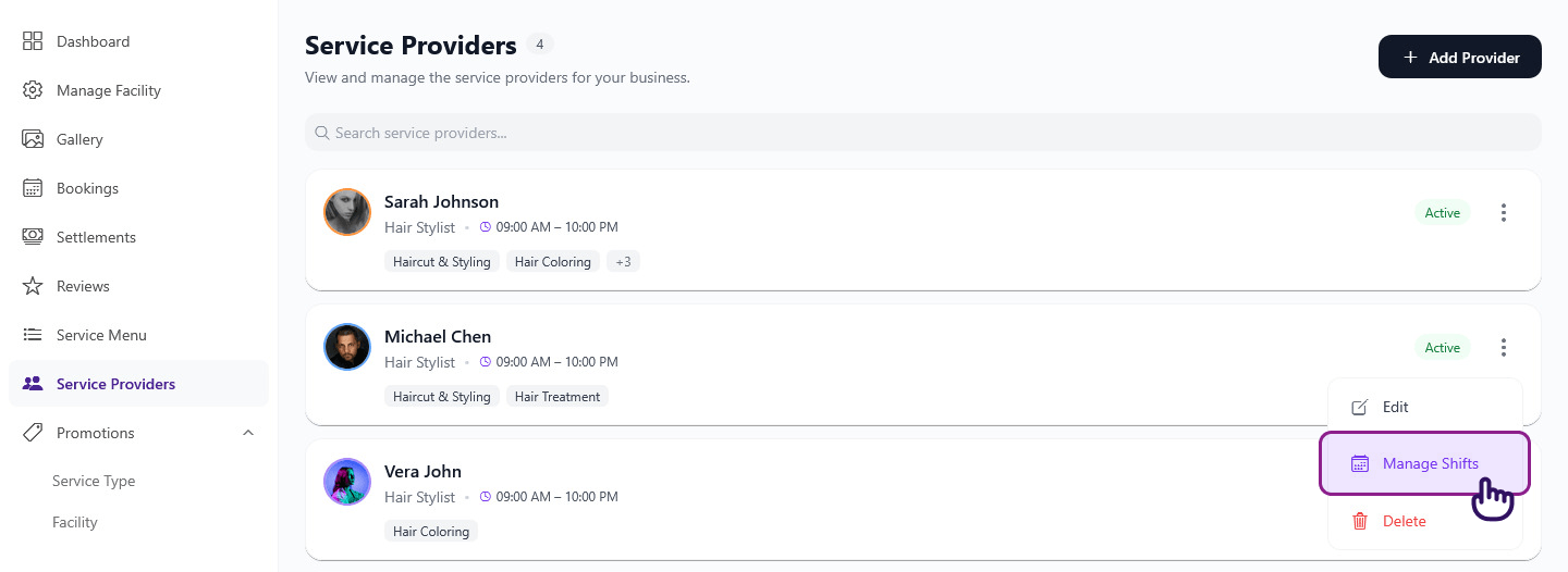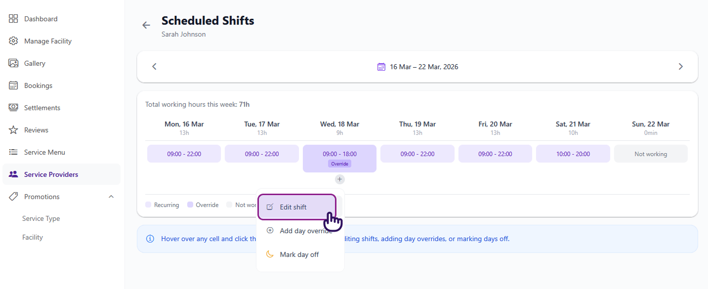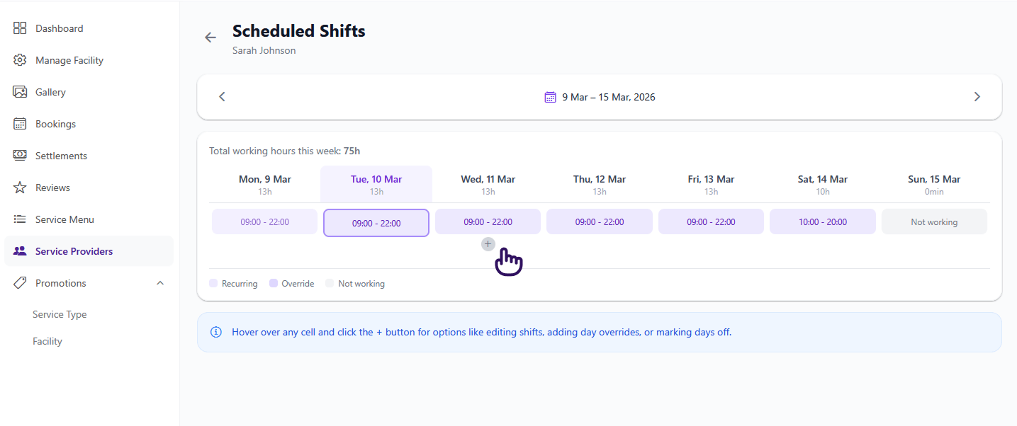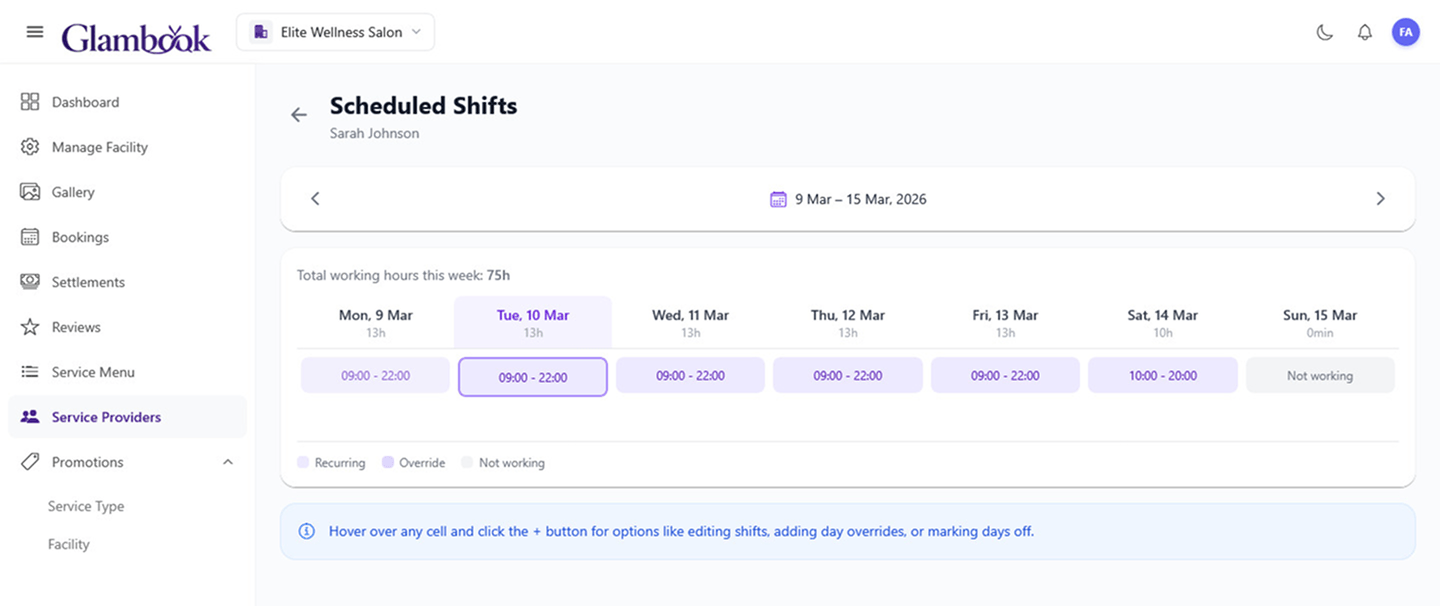 - Shifts must fall within your salon's operating hours — a provider can't be scheduled when the salon is closed
