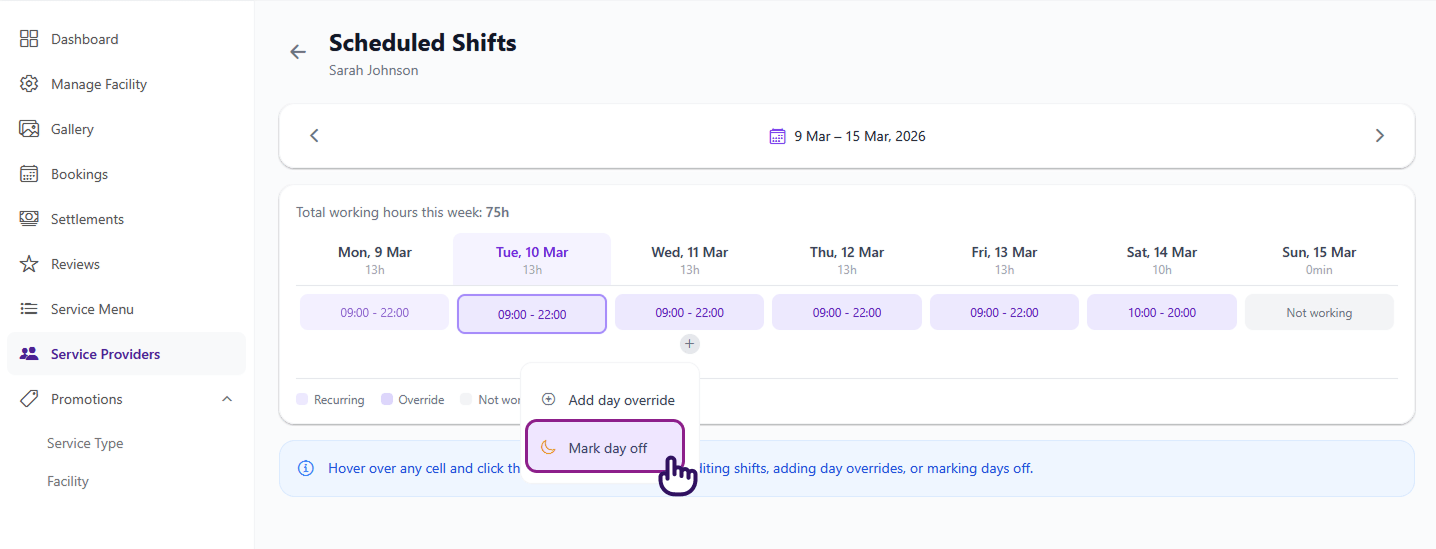 Marking a day off overrides any recurring shift for that date. Existing bookings on that day are not automatically cancelled.